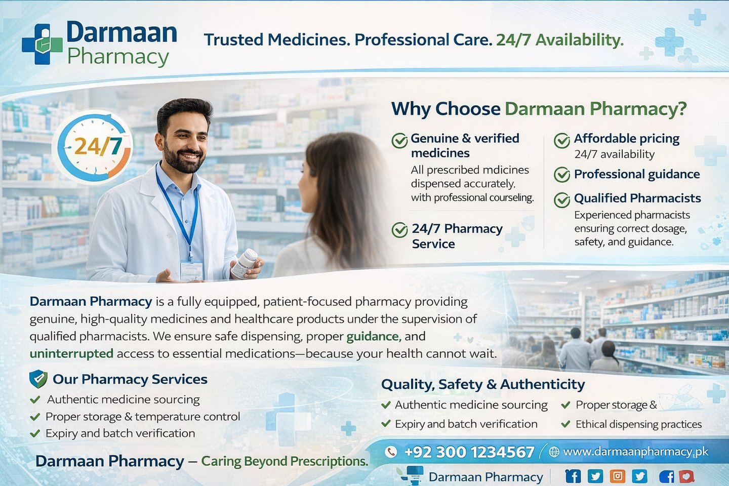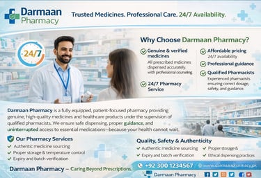 Darmaan Pharmacy is a fully equipped, patient-focused pharmacy providing genuine, high-quality medicines and healthcare products under the supervision of qualified pharmacists. We ensure safe dispensing, proper guidance, and uninterrupted access to essential medications—because your health cannot wait.